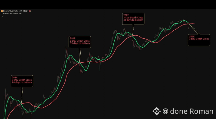 In each cycle, a 3-day Death Cross showed up — and roughly 30 days later, the market printed its cycle low.