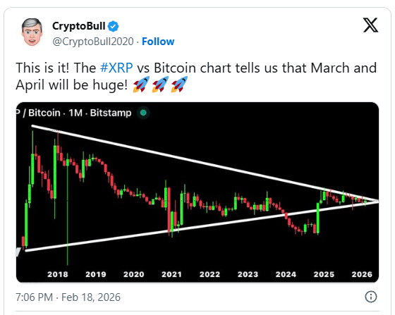 Despite the mixed responses, CryptoBull’s message remains focused on the chart structure itself. By highlighting a multi-year triangle on the XRP/BTC monthly timeframe and pinpointing March and April as critical periods, he has framed the coming weeks as potentially decisive for XRP’s performance relative to Bitcoin.