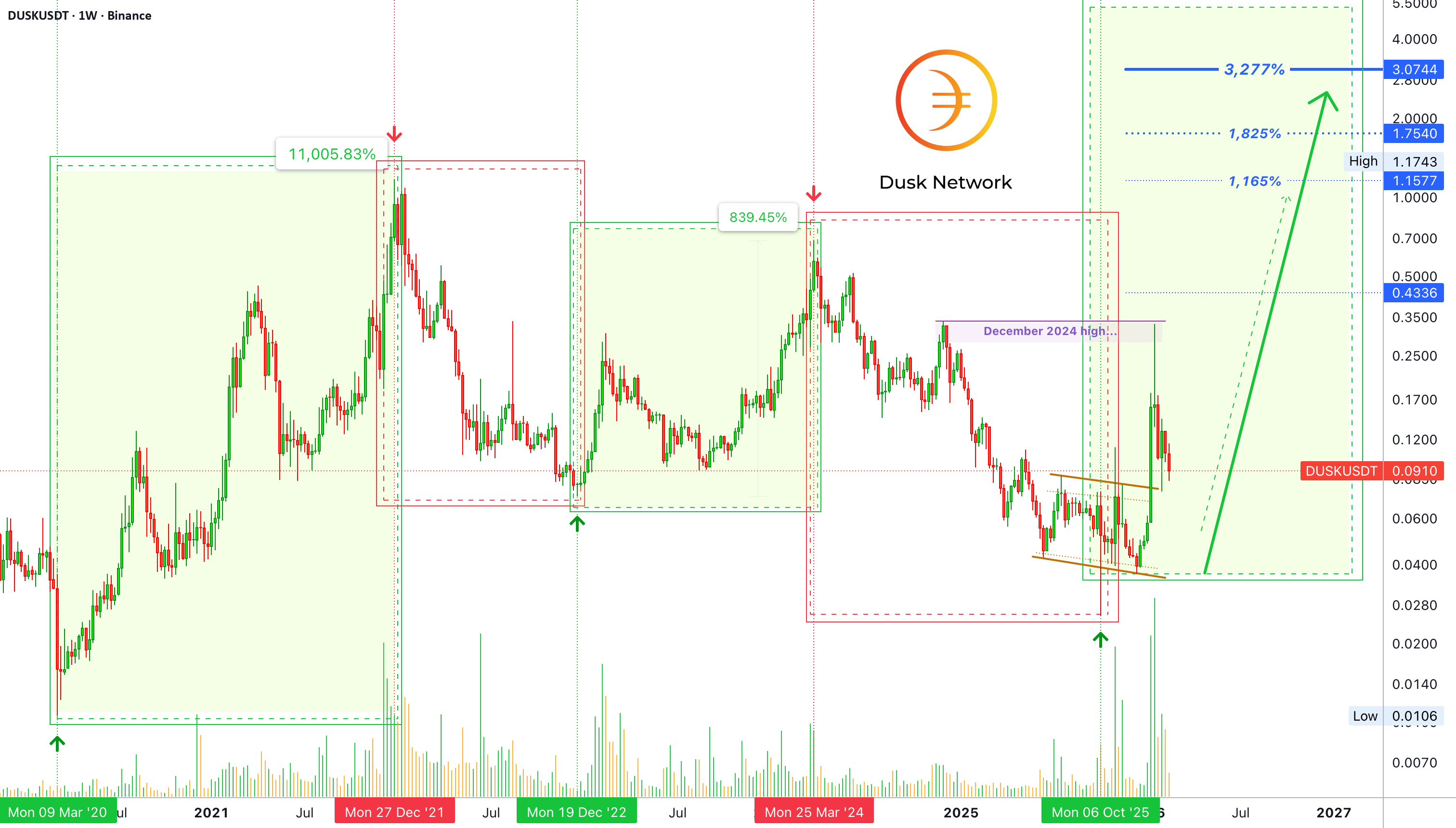 Dusk Network hit bottom mid-December 2025. An entire group bottomed in December last year and the market always moves in groups.