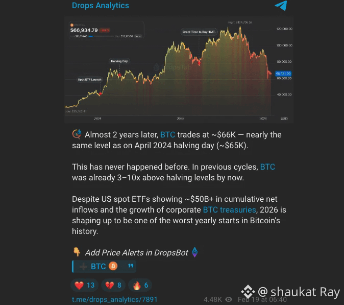 “Almost two years later, BTC trades around $66,000 — nearly the same level as during the April 2024 halving,” Drops Analytics said in a Telegram post on Thursday.