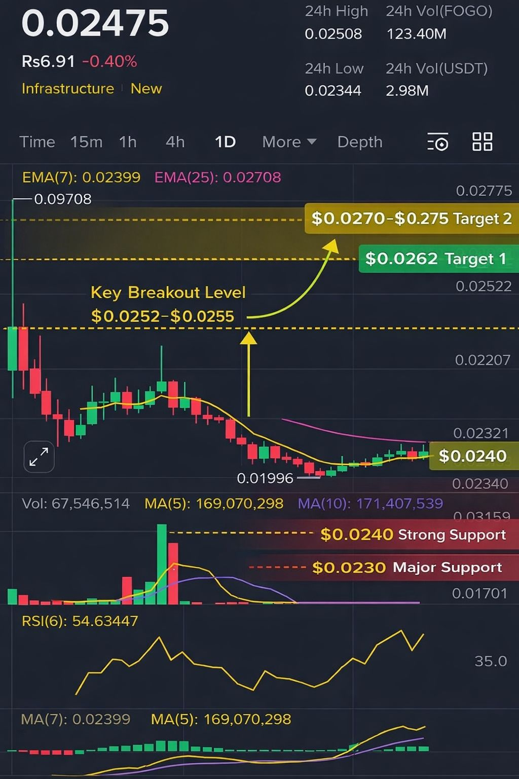 $FOGO /USDT is trading near $0.02475, showing improving bullish momentum on the daily chart.