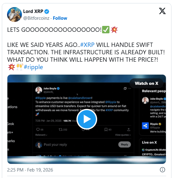 Lord XRP, a prominent voice within the XRP community, spotlighted a clip from Paul Barron’s podcast in which a crypto executive discussed integrating Ripple Payments into his firm’s operations. The comments quickly circulated online, fueling renewed speculation that XRP could play a meaningful role in handling transaction volumes traditionally associated with SWIFT.
