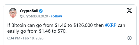 Bitcoin’s performance over the past decade serves as a benchmark for understanding XRP’s potential. XRP currently trades at $1.46, and CryptoBull drew attention to it when Bitcoin was at that level. Bitcoin eventually reached above $126,000, demonstrating how digital assets can achieve extraordinary growth.