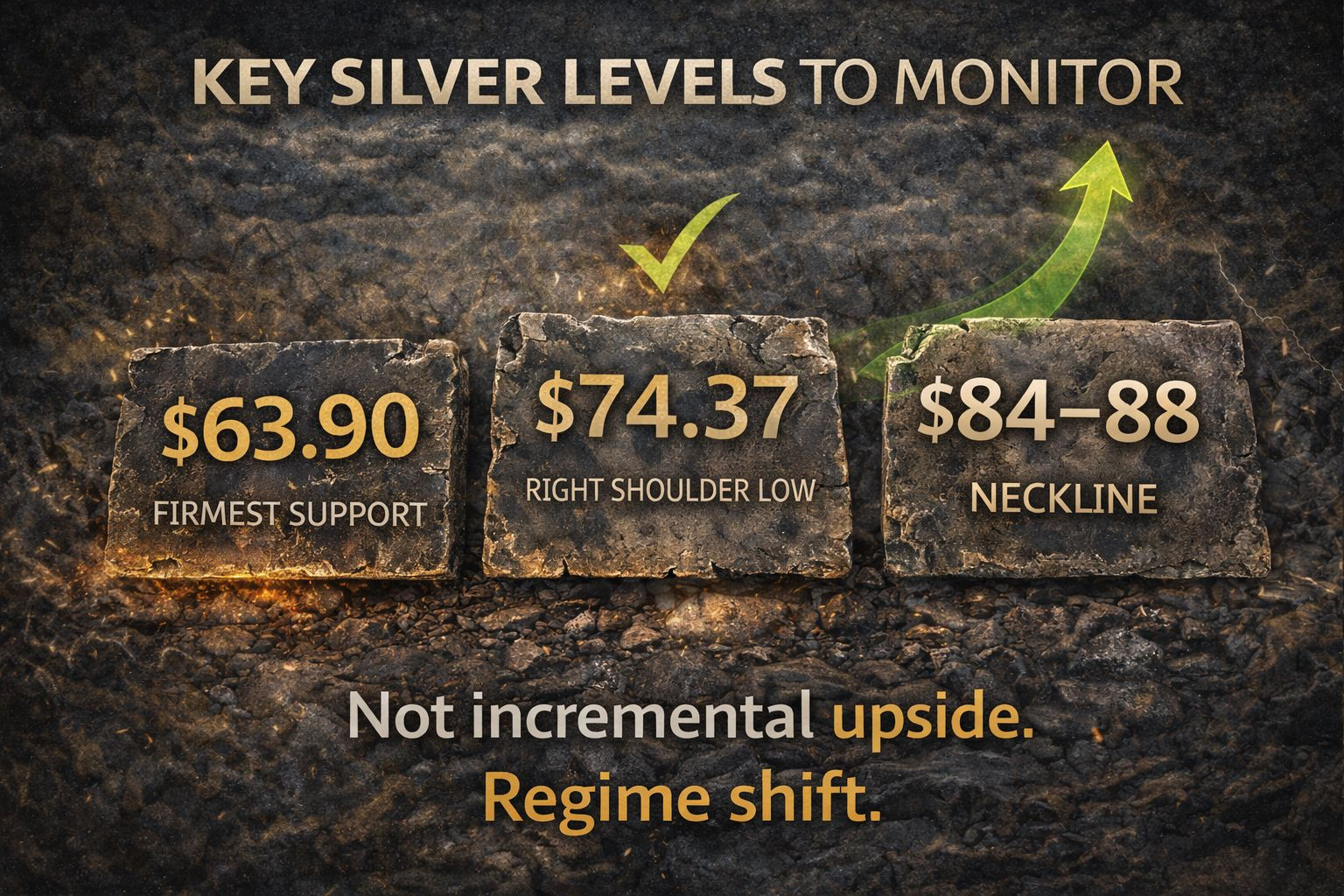 A high-volume break above this range transitions silver into a new price regime.