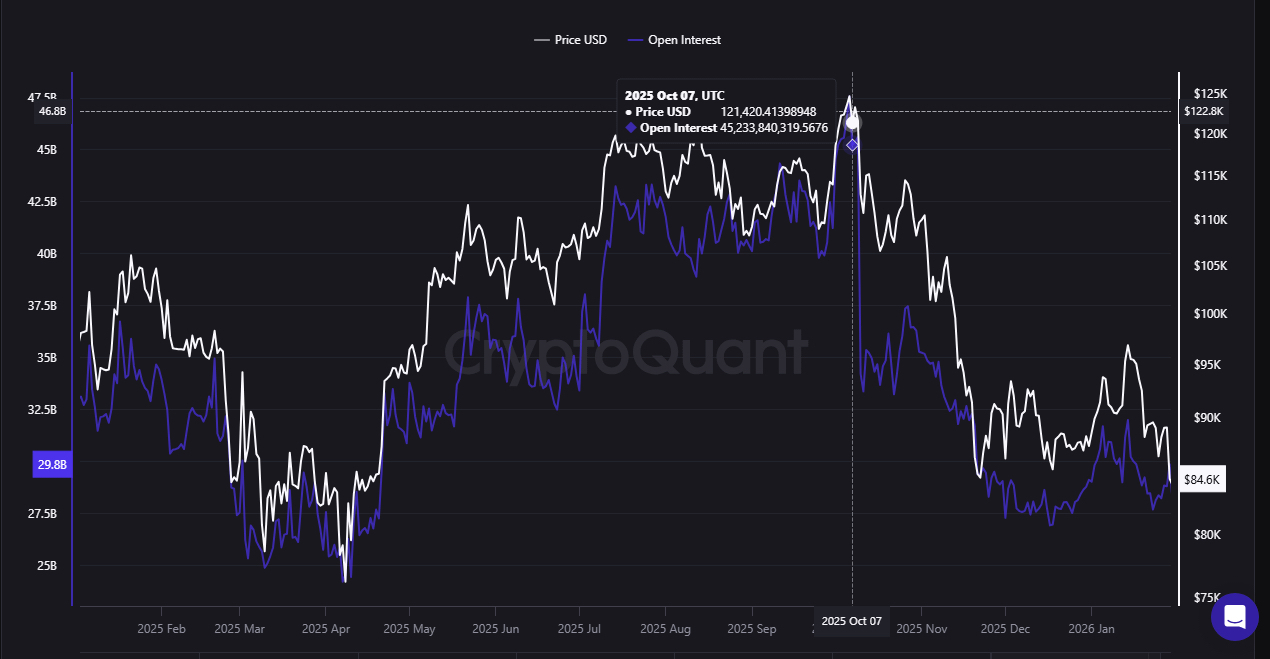 Bitcoin’s Open Interest (OI) — the total notional value of outstanding futures contracts — peaked near $47.5B on October 7, 2025, right as price printed its latest ATH.