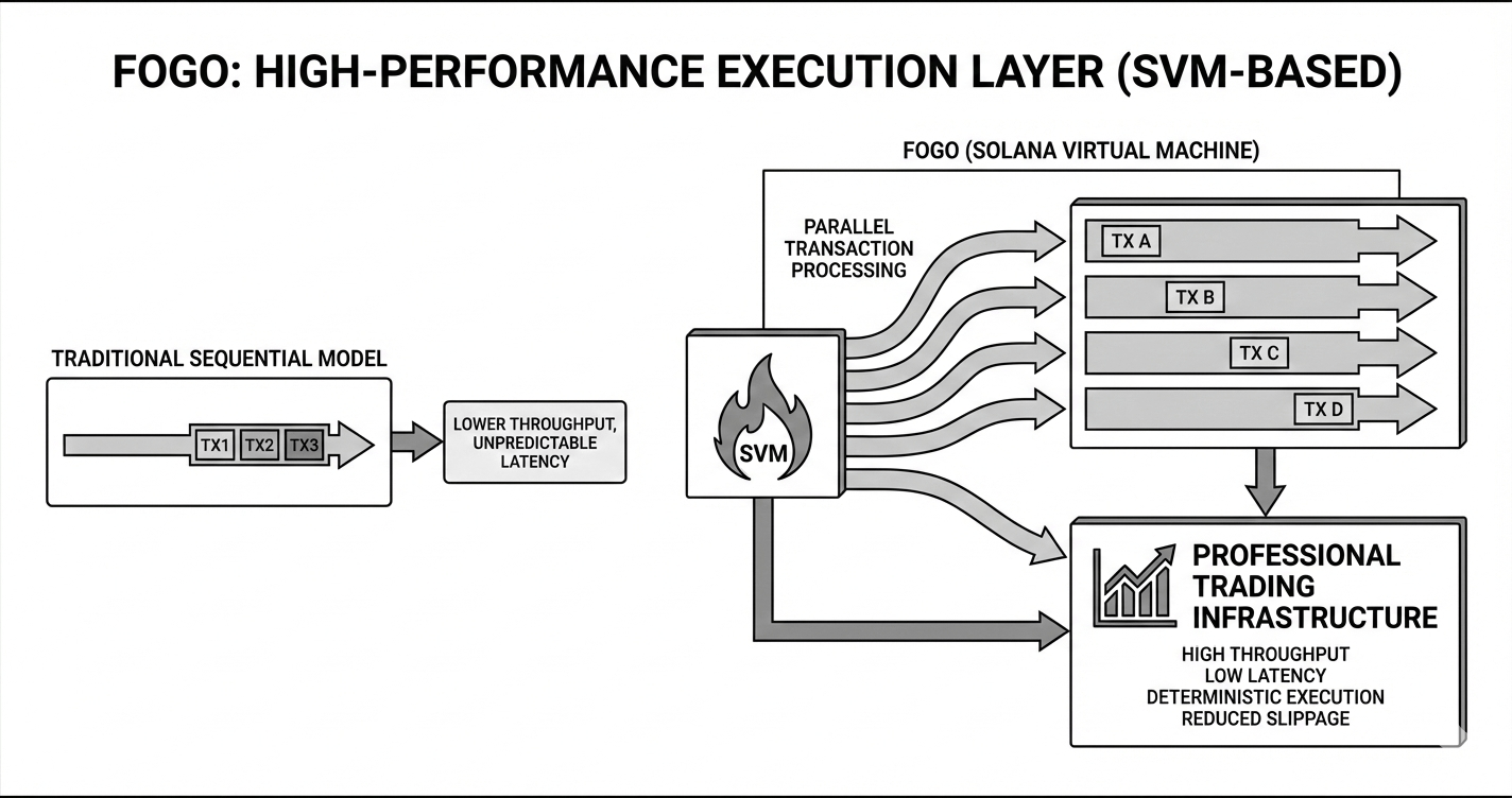 Fogo is built on the execution environment developed by Solana Labs for Solana, leveraging the Solana Virtual Machine and its parallel transaction processing design. Unlike traditional sequential models where transactions are processed one after another in strict order, the SVM allows non-conflicting transactions to execute simultaneously, unlocking a level of throughput and responsiveness that more closely resembles professional trading infrastructure.