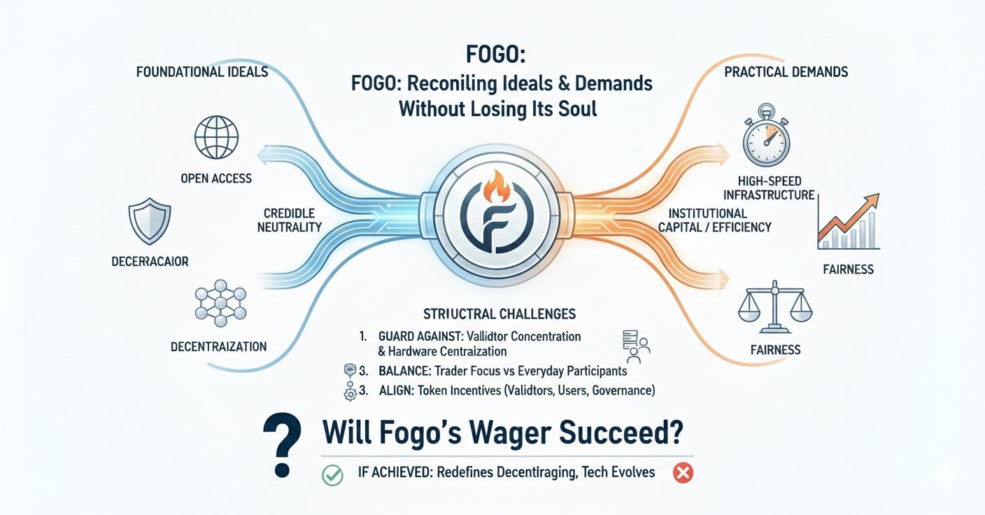 At its core, Fogo represents a wager that decentralization can mature without losing its soul. It suggests that efficiency and fairness do not have to exist in opposition, and that markets built on transparent, high-speed infrastructure can still honor open access and credible neutrality. Whether this wager ultimately succeeds remains uncertain, because markets are unforgiving and technology evolves rapidly. Yet the willingness to confront the tension directly, rather than hiding behind slogans, is itself significant. In a landscape often dominated by noise, Fogo’s approach feels like a deliberate attempt to reconcile the ideals that sparked crypto with the practical demands of modern financial systems, and that reconciliation, if achieved, could redefine what decentralized trading truly means.