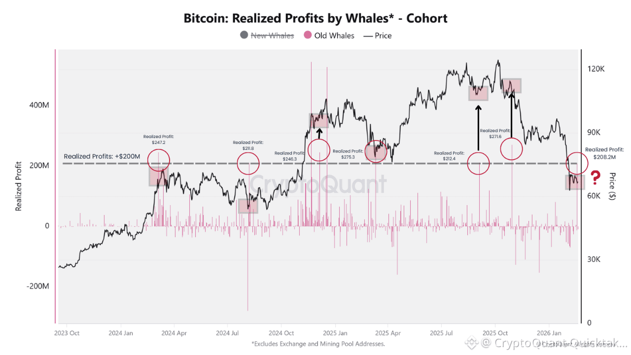 Old whales have just realized +$208M in profits, marking the seventh event in the past two years where realized profits exceeded $200M for this cohort.