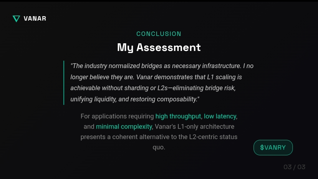Vanar demonstrates that L1 scaling is achievable without sharding or L2s, given appropriate architectural foundations. This eliminates bridge risk, unifies liquidity, and restores composability.