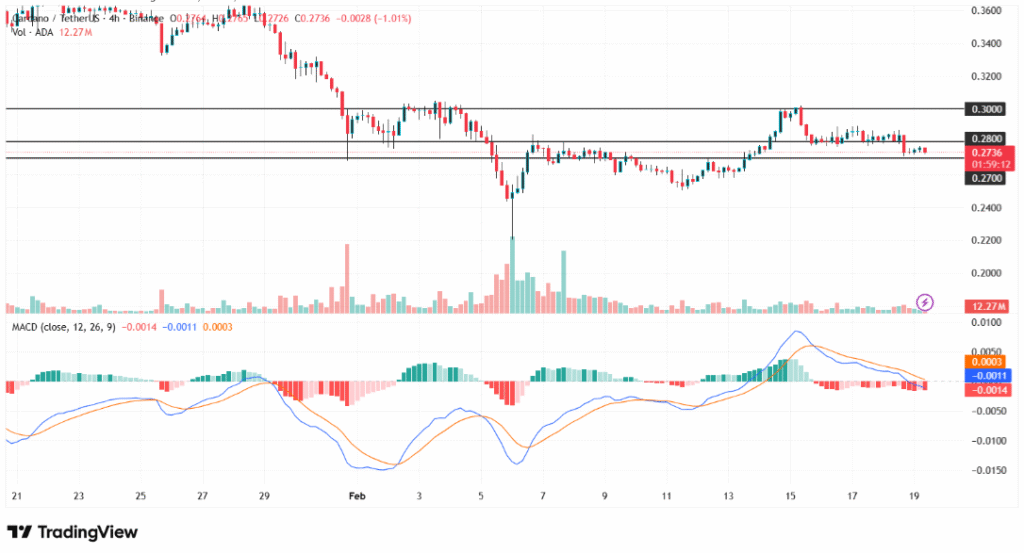 At the time of writing, ADA traded around $0.275, reflecting a mild intraday decline. However, the token continues to move between support at $0.27 and resistance near $0.30. Technical indicators such as the MACD show the signal line above the MACD line, pointing to short-term bearish pressure.