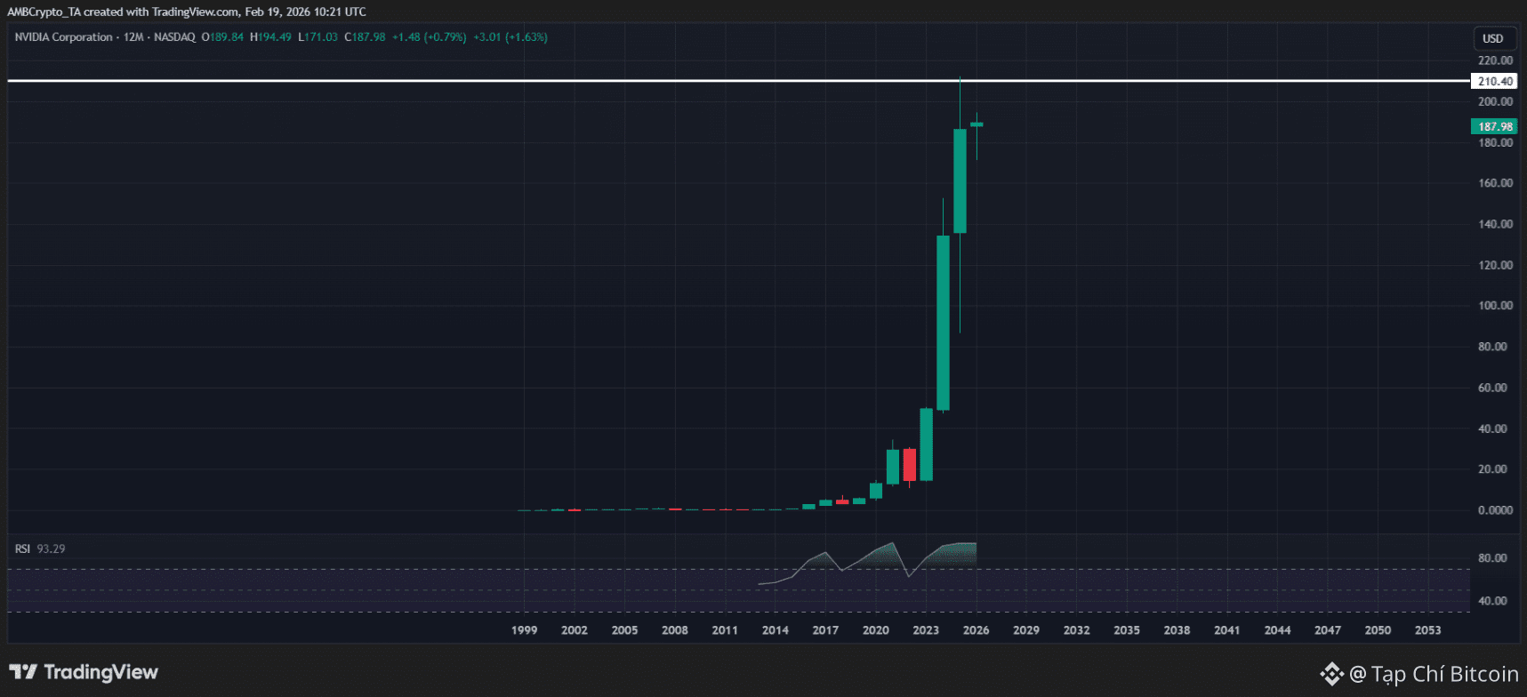 Trên biểu đồ, Bitcoin (BTC) từng giảm tới 24%, trong khi cổ phiếu Nvidia (NVDA) tiếp tục nối dài đà tăng sau cú bứt phá 39% trong năm 2025. Khép lại năm, BTC ghi nhận mức giảm 6,3% — một minh chứng rõ ràng cho việc cổ phiếu công nghệ đã “cưỡi sóng” AI mạnh mẽ đến mức nào.