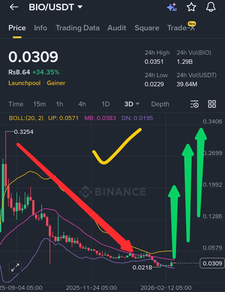 For a sustained bullish reversal, $BIO must hold above 0.028–0.030 and build higher lows. A strong push toward 0.038–0.045 (mid-band region) would confirm structure shift. Failure to maintain support could turn this into a temporary relief rally.