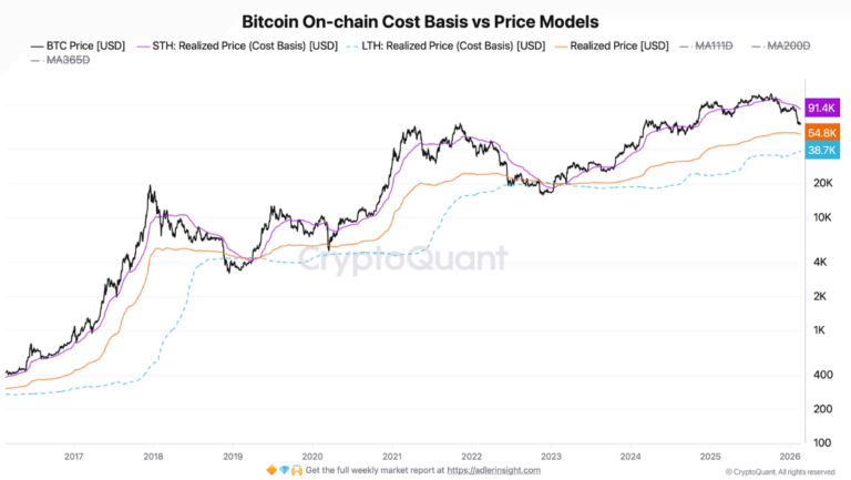 Notably, Bitcoin has not closed below this level in over 1,100 days a streak that highlights the relative resilience of long-term holders even during prolonged downturns. The short-term holder realized price stands higher at $91,400, while long-term holders remain in profit with a realized price near $38,700.