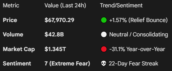 In the last 24 hours, the divergence between traditional and digital stores of value has reached a breaking point. While Gold surges on the back of central bank accumulation and geopolitical hedging, Bitcoin (BTC) remains trapped in a brutal "Extreme Fear" cycle.