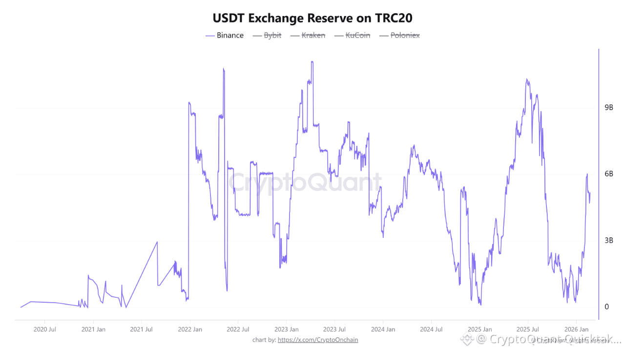Following the recent market pullback that pushed Bitcoin and Ethereum toward key technical support levels, on-chain data shows a notable structural response. Binance’s USDT Exchange Reserve on the TRC20 network increased significantly, rising from 385M on December 24 to approximately 5.2B.