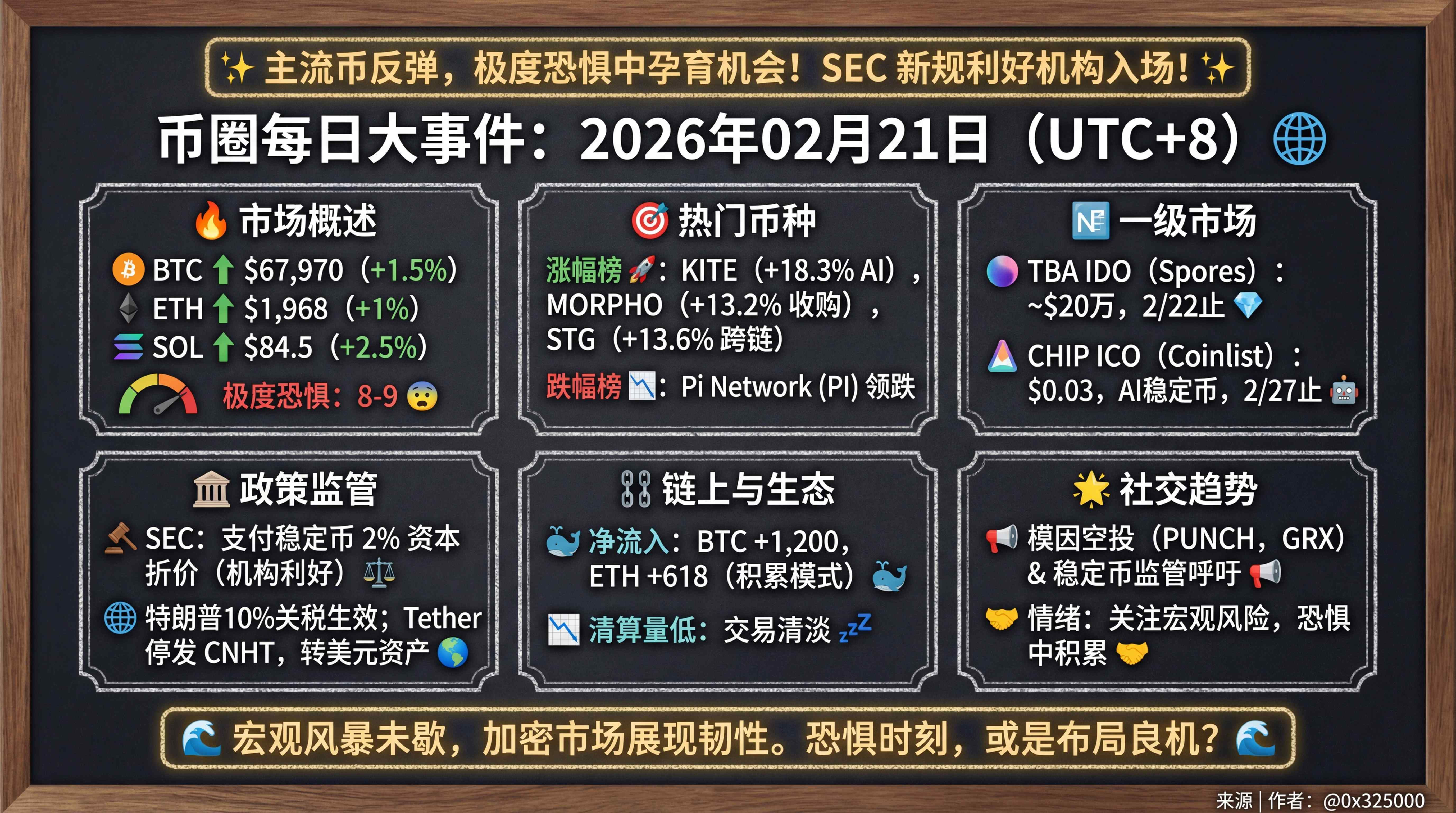 比特币涨至 $67,970 (+1.5%),以太坊微升至 $1,968 (+1%),Solana 升至 $84.5 (+2.5%),主流币种在轻度风险偏好中反弹!📈