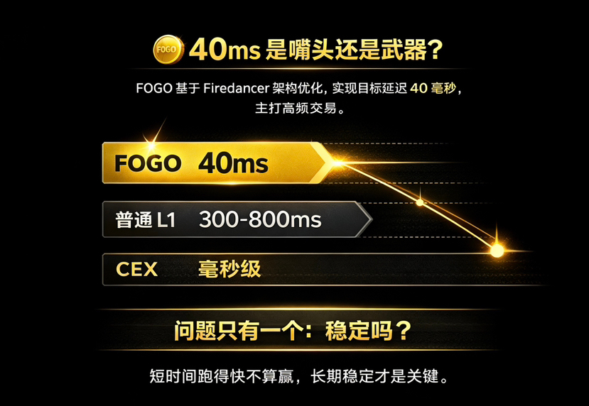 FOGO 的核心卖点很清楚。低延迟,主打高频交易。它基于 Firedancer 架构优化。目标延迟 40 毫秒级别。