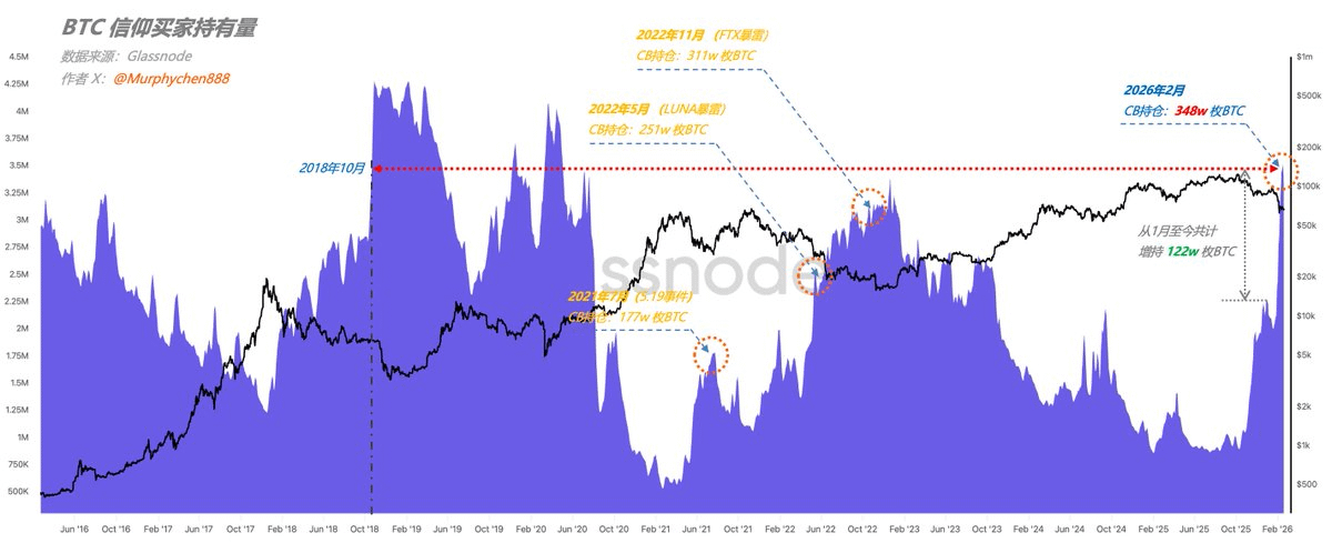 截止到2月,CBer们已累计持仓达 348w 枚BTC,再次刷新了本轮周期的最高记录。单是从今年1月至今,就大幅增持了122w 枚;这个数据已经远超上轮周期5.19事件、LUNA暴雷以及FTX暴雷时期。