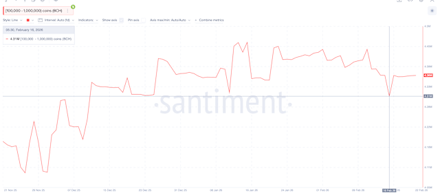 This strength is now clearly visible in whale behavior. The largest Bitcoin Cash holders, wallets holding between 100,000 and 1 million BCH, increased their holdings from 4.31 million BCH on February 16 to 4.36 million BCH recently.