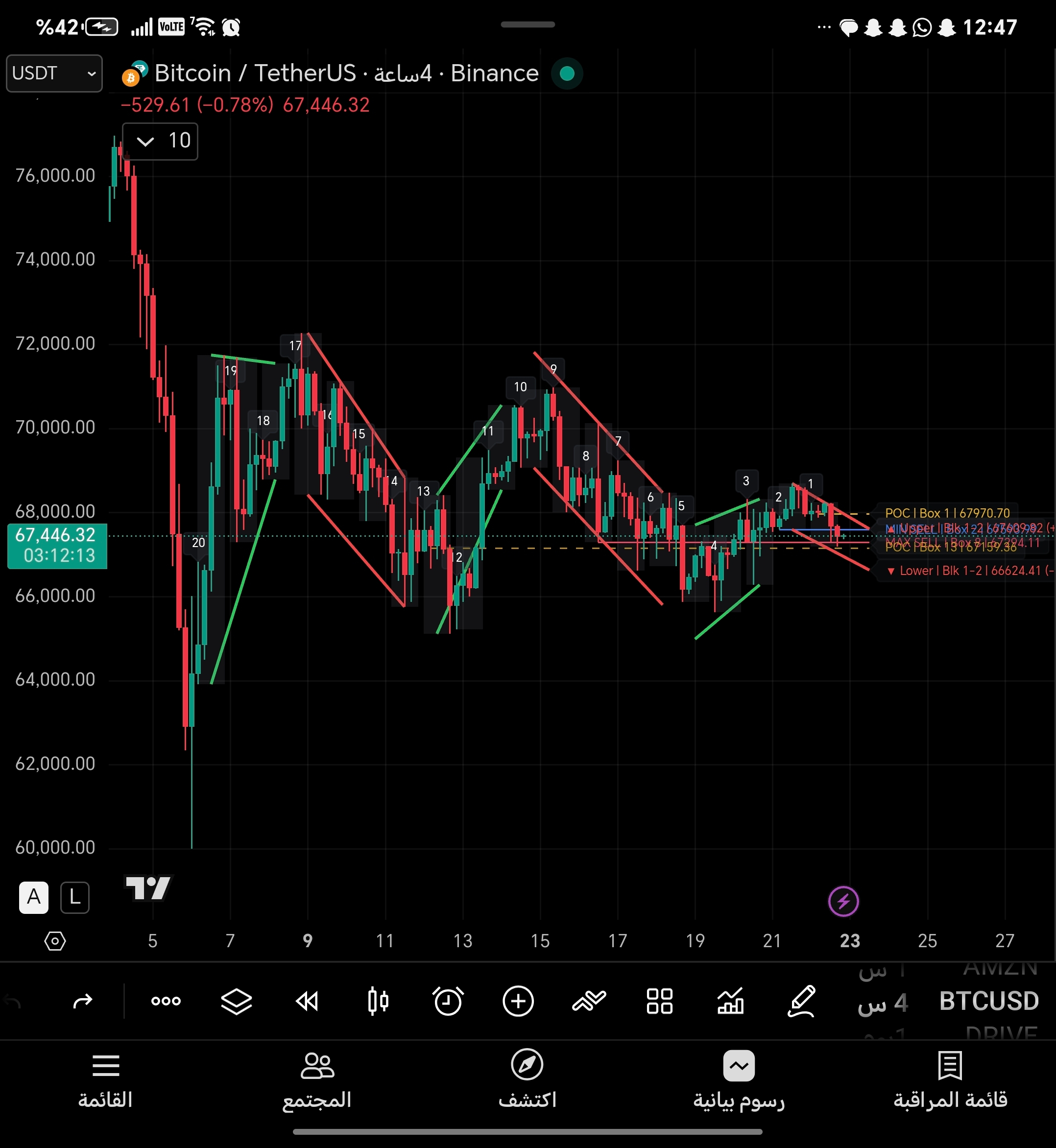 ملاحظة مهمة: السعر اقترب من حد القناة العليا عند 67609.82 (المسافة %0.27). السعر اقترب من POC 67970.70. السعر قريب من حد القناة السفلى عند 66624.41 (المسافة %1.19). السعر قريب من مستوى POC 67159.36 والتي عادة تشهد حجم تداول مرتفع. السعر قريب من MIN SELL | Box 2 @ 67593.99 (المسافة %0.25). السعر قريب من MAX SELL | Box 8 @ 67294.11 (المسافة %0.2).
