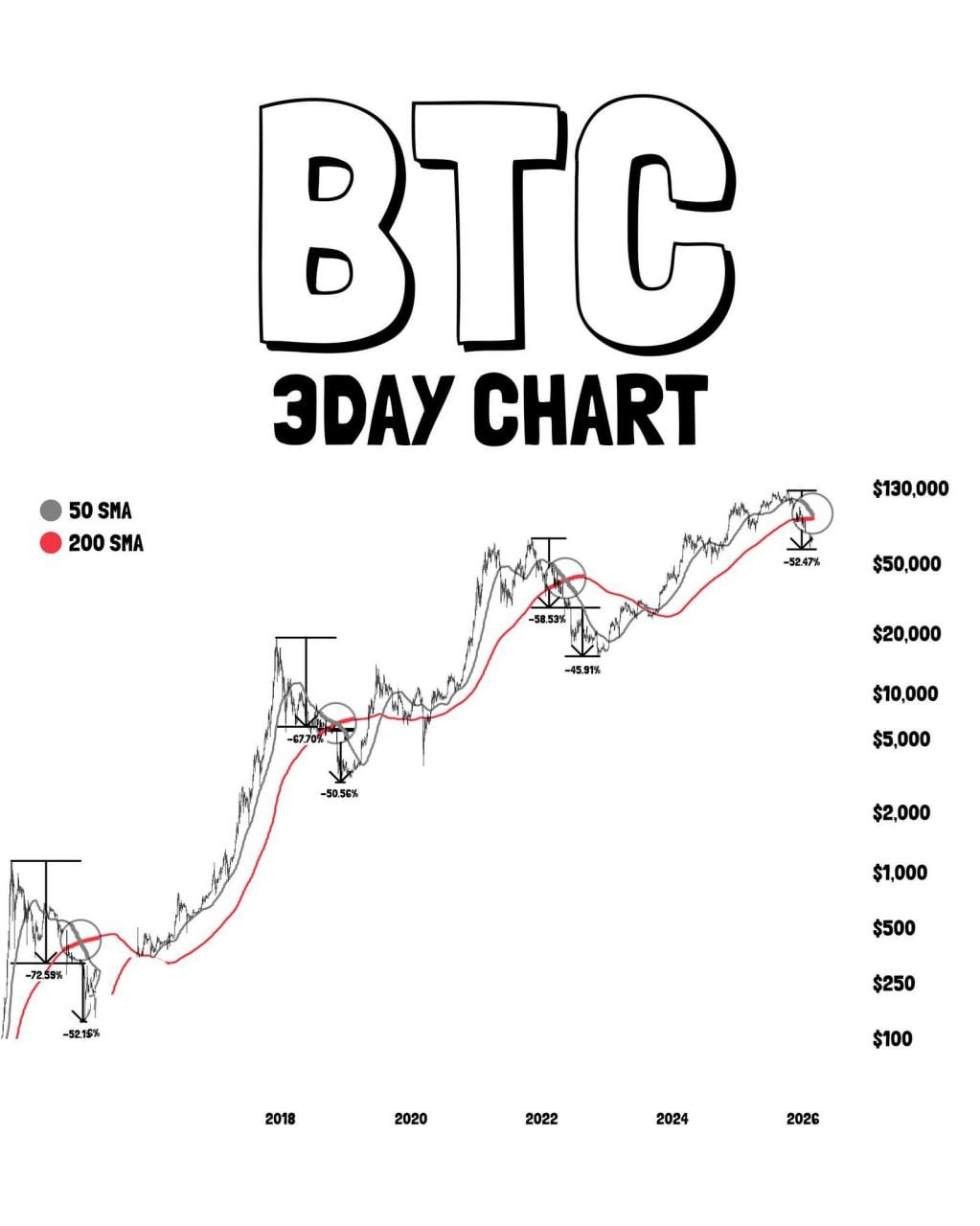 С 2014 года «крест смерти» (пересечение 50- и 200-дневных SMA на 3D-графике) исторически предшествовал финальной фазе медвежьего рынка.