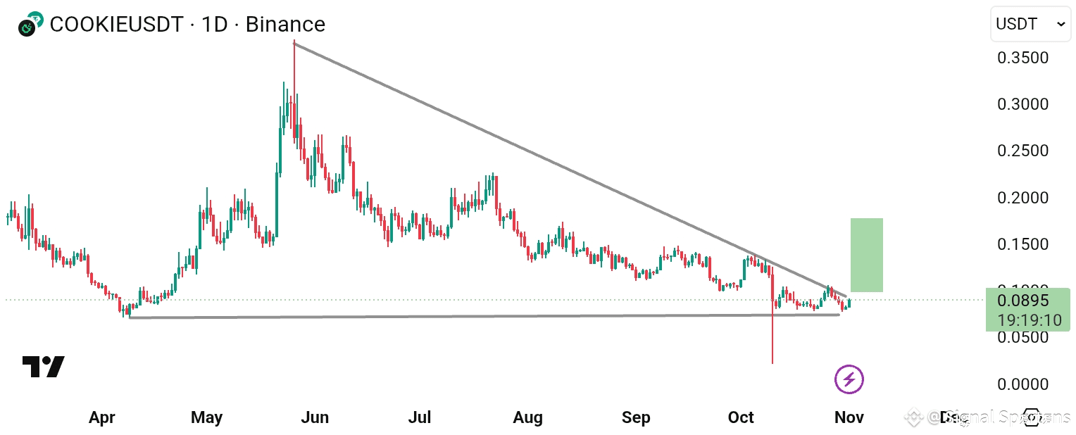 $COOKIE is forming a clear Falling Wedge 📈 on the Daily timeframe after a -74% drop, now holding strong support at 0.0895 USDT 🧠.