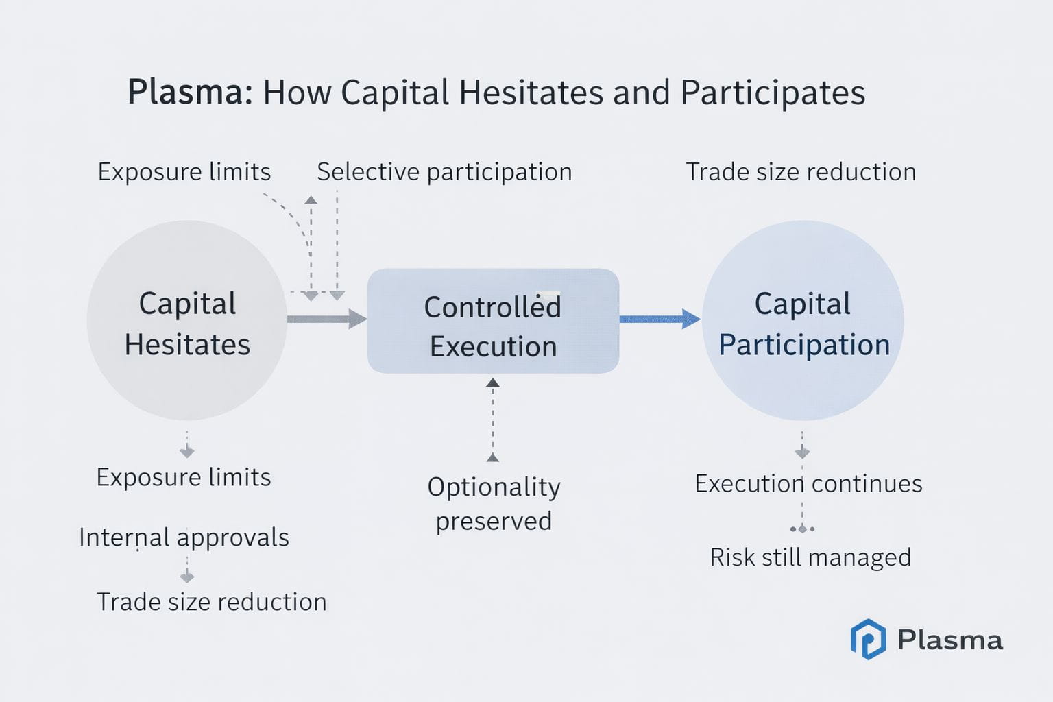 In traditional finance, hesitation shows up long before anything breaks. Limits tighten. Trade sizes shrink. Internal approvals take longer than expected. Nothing is technically wrong, yet commitment fades. Many blockchain designs struggle here because they quietly assume full exposure just to stay operational. Plasma doesn’t appear to make that assumption.