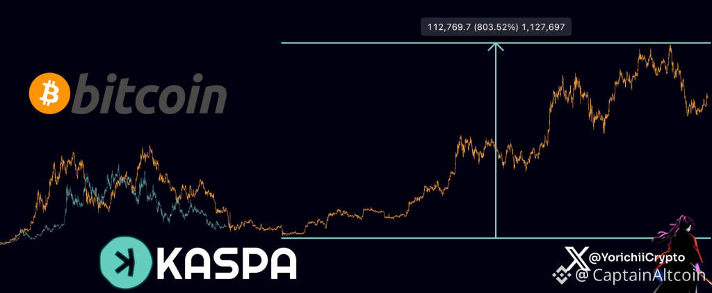 The comparison was highlighted by analyst Yoriichi Tsugikuni, known on X as @YorichiiCrypto, who shared a chart aligning Kaspa price structure with Bitcoin’s historical setup before its major rally. The chart focuses on how Bitcoin price spent months moving sideways, building a base, and slowly gaining strength before breaking out into a sustained move that delivered an 803% advance over time.