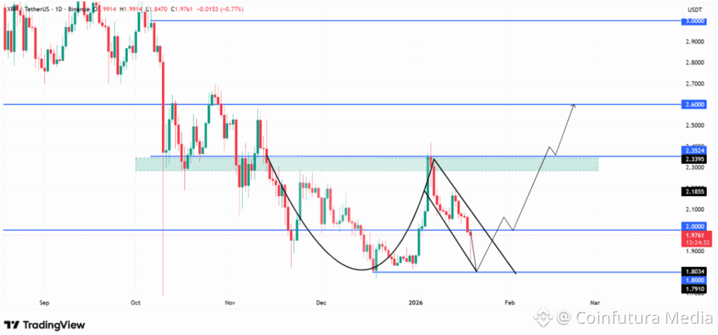 XRP broke below $2.00 but remains inside a structural support range, preserving the larger cup-and-handle technical formation.