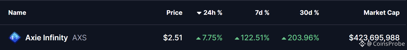 Axie Infinity (AXS), the token behind the popular blockchain-based gaming ecosystem, has delivered a stunning comeback. Over the past 30 days, AXS has surged by nearly 204%, with price now hovering around the $2.50–$2.55 region. The rally has been especially aggressive in recent sessions, with gains of over 122% in the last week alone and an additional 7–8% move in the past 24 hours, backed by a clear rise in trading volume.