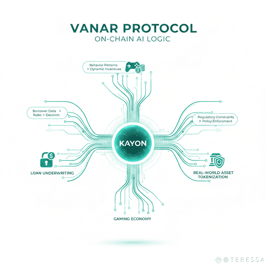 @Vanar embeds reasoning directly into the protocol through Kayon, its on-chain AI logic engine. Unlike external AI services bolted onto a blockchain, Kayon allows smart contracts and autonomous systems to query data, apply logic, and reach conclusions entirely within the chain. A loan underwriting system can analyze borrower risk data, apply deterministic compliance rules, and make lending decisions without ever leaving the blockchain. A gaming economy can analyze real-time behavioral patterns and adjust incentives dynamically. A real-world asset tokenization platform can enforce regulatory constraints through embedded policy logic that is verifiable and immutable.