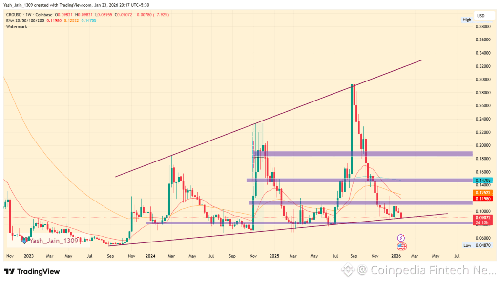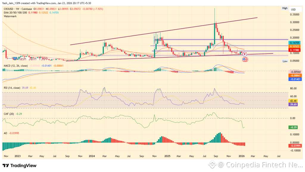At the same time, resistance levels from earlier rallies continue to slope higher, forming a ascending broadening structure. While this setup increases volatility risk, it also keeps the possibility of an upside expansion intact if demand strengthens. Therefore, CRO price USD movements around this support are being closely watched by spot market participants.
