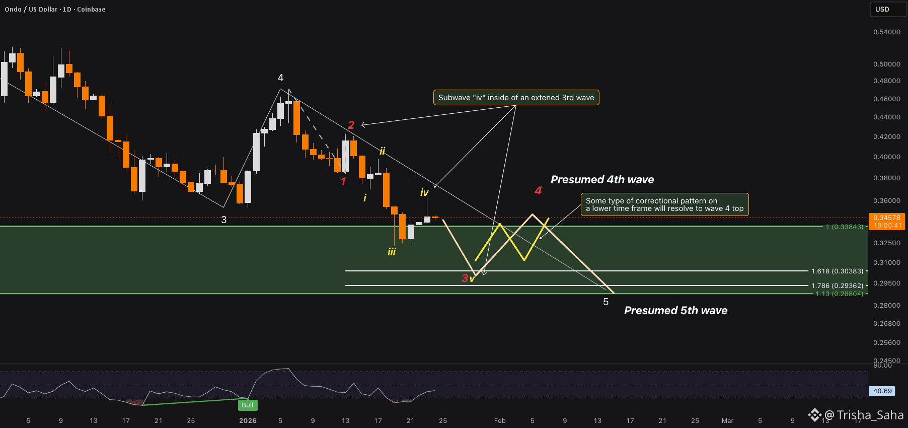 ONDO Potentially printing sub-wave 5 of an extended 3rd wave of one higher degree. This suggests lower lows for ONDO. This also hints that the 5th impulsive wave of an even higher degree is not in yet. Key take away: Price is still impulsive to the downside.