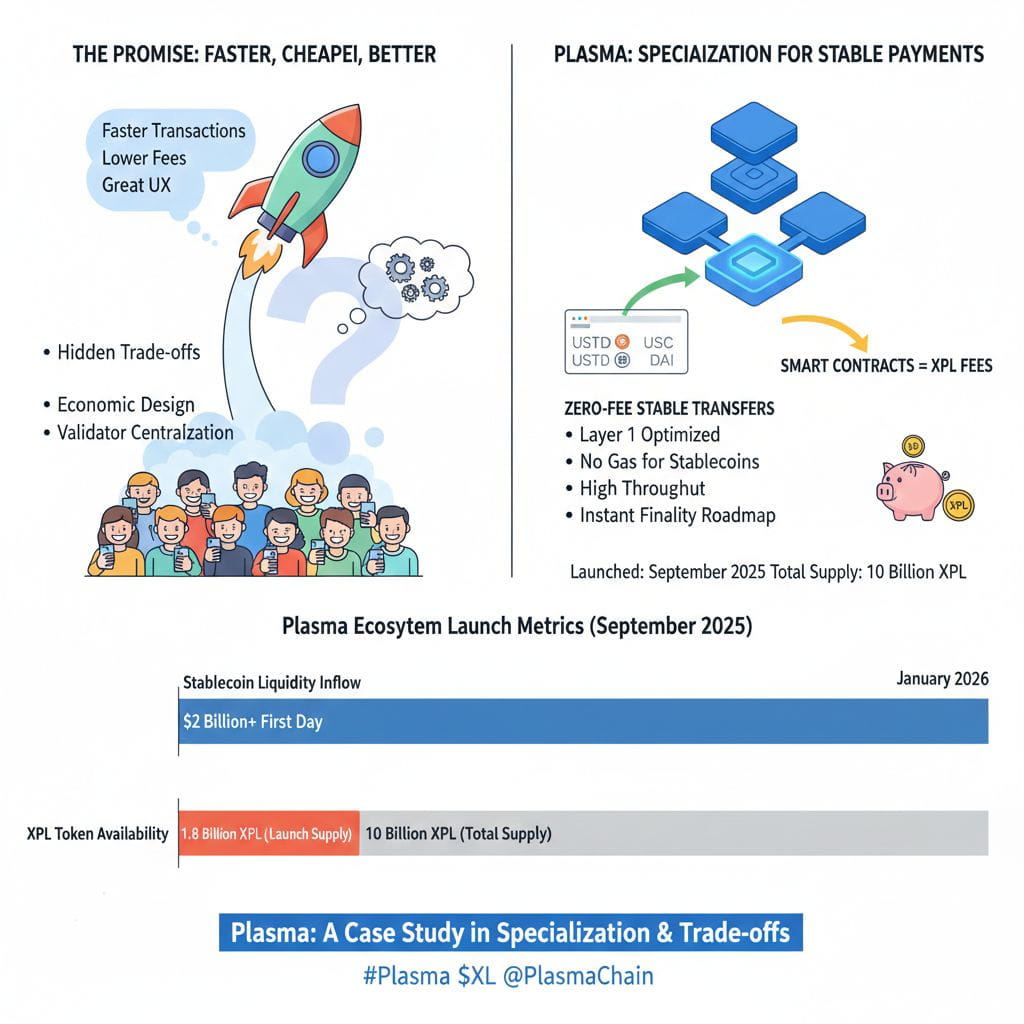 Another important trade-off is economic design, where plasma has free transfers of stablecoins but incurs XPL when executing a smart contract. The former reduces costs but makes token demand focus more on smart contract activity. From a trader's point of view, I find it interesting how it disrupts the dynamic well-known to other systems in which users pay gas costs but now generate value through applications, validators, and infrastructure participants. Moreover, in a practical sense, this also means that XPL's value will depend more heavily upon developers adopting XPL and applications developing, a slower and less predictable process.