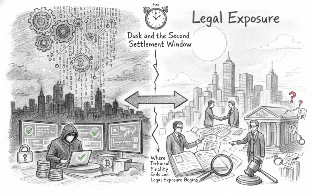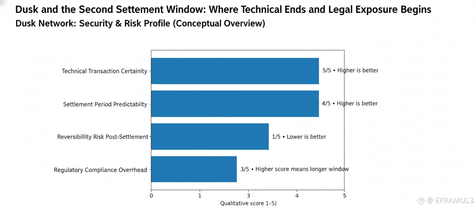 Most blockchains treat settlement as a single moment: a transaction confirms, the block is finalized, and the system declares success. Finance has never worked that way. In regulated markets, the point where machines say “done” and the point where the law says “done” are separated by an invisible but critical buffer. Between those two points lies exposure to disputes, reversals, compliance checks, counterparty defaults, and legal interventions. Dusk is the first network that explicitly designs for that second settlement window instead of pretending it does not exist.