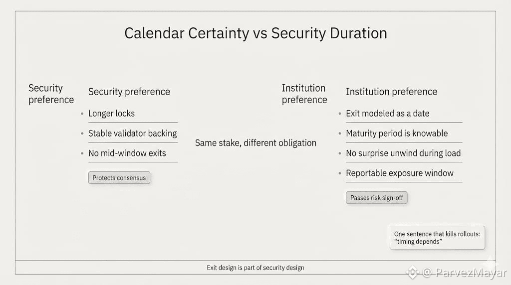 On Dusk, that question shows up early. Not from yield desks, but from risk desks that already assume the return is fine and want the exit shaped like a date, not a surprise. Security likes long locks. Institutions like calendars. Same tension, every time.