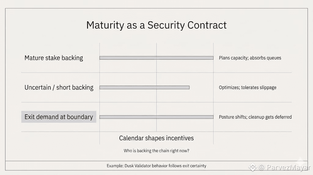 That's what the maturity period is really doing. Short enough that exits can be planned without panic. Long enough that security is not rented from capital that can disappear mid-cycle. Most models blur this, then act shocked when unstake demand lines up on the same boundary.