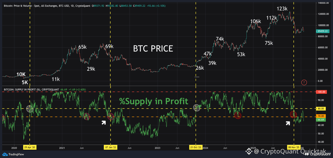 When #Bitcoin Supply in Profit drops below 70% and fails to recover above 80%, it is historically a sign of a potential further decline and often a confirmation of a bear market. Let’s monitor it closely.