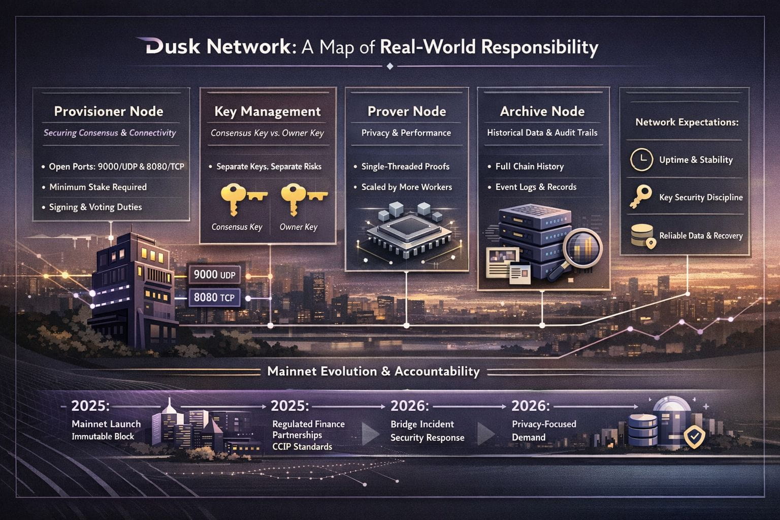 If you want the title to mean something—“real-world responsibility”—the operator guide is where that meaning shows up. Dusk’s documentation is essentially a checklist of what the network will demand from adults in the room: stable networking, disciplined key separation, honest compute planning for proving, and archival infrastructure that makes the chain legible over time. It doesn’t guarantee success. But it does suggest a network that expects to be judged the way serious systems are judged: by uptime, recoverability, and whether the boring parts were treated as first-class citizens.