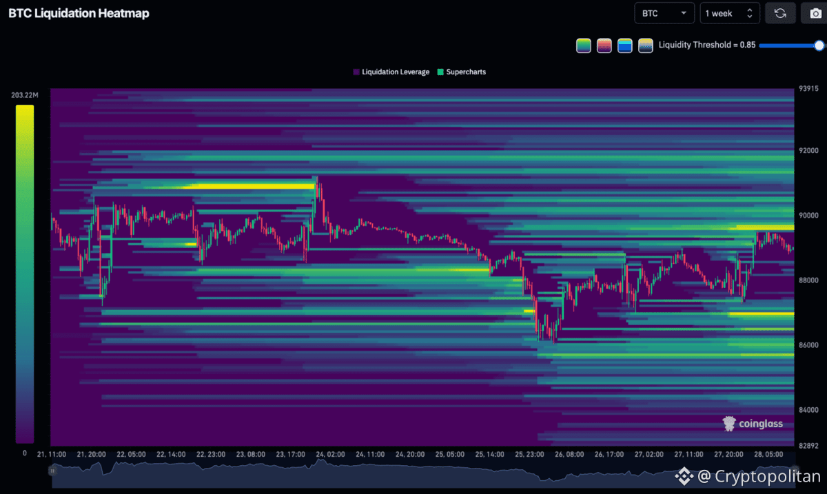 On the downside, liquidity clusters are notably thicker between $88,000 and $86,000, with additional depth extending toward the mid-$85,000s, pointing to leveraged long exposure accumulating below the range.