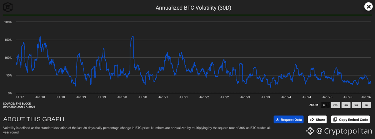 What is striking is that Bitcoin’s historical volatility is tightening further in the short term as price remains constricted in the narrow range. This is reflected in the 30-day realized volatility metric, which measures the standard deviation of BTC’s daily returns over a rolling 30-day window and annualizes the result.