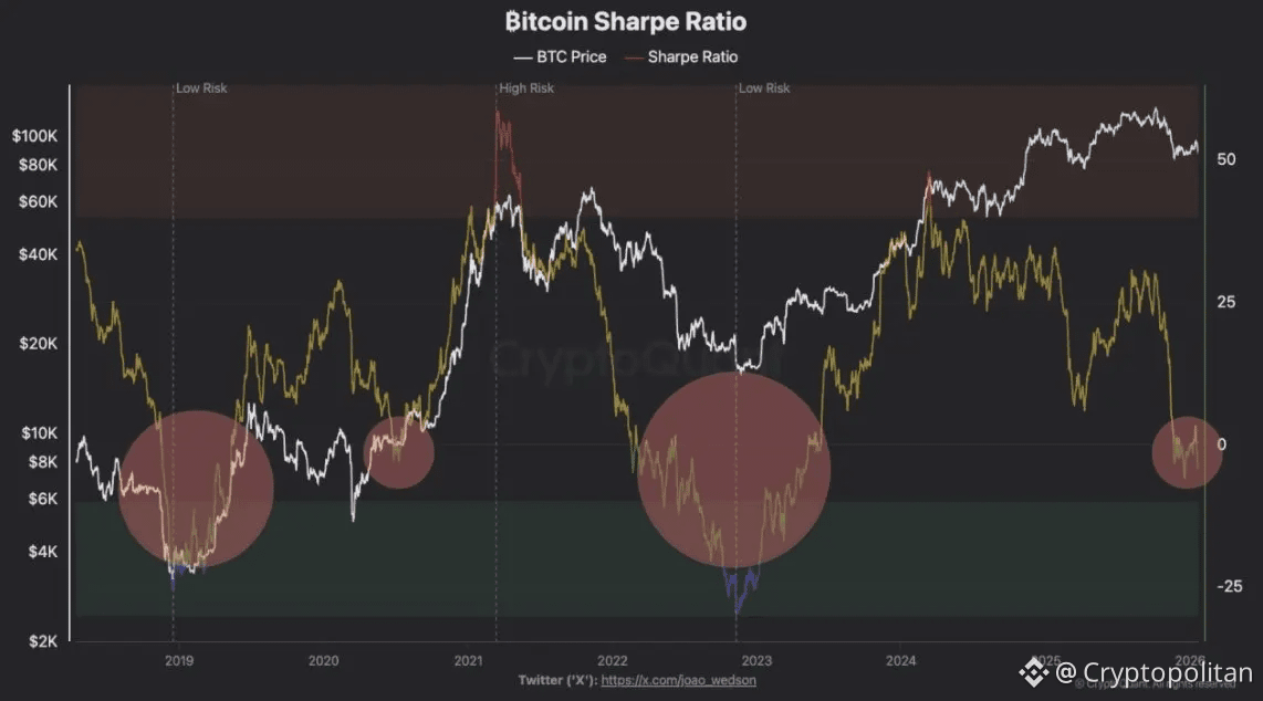 As shown in the chart, Bitcoin’s Sharpe ratio has once again fallen to levels historically associated with major market bottoms. These troughs typically emerge when volatility remains elevated relative to returns, or when returns stagnate while volatility contracts, both characteristics of late-stage consolidations and sentiment exhaustion.