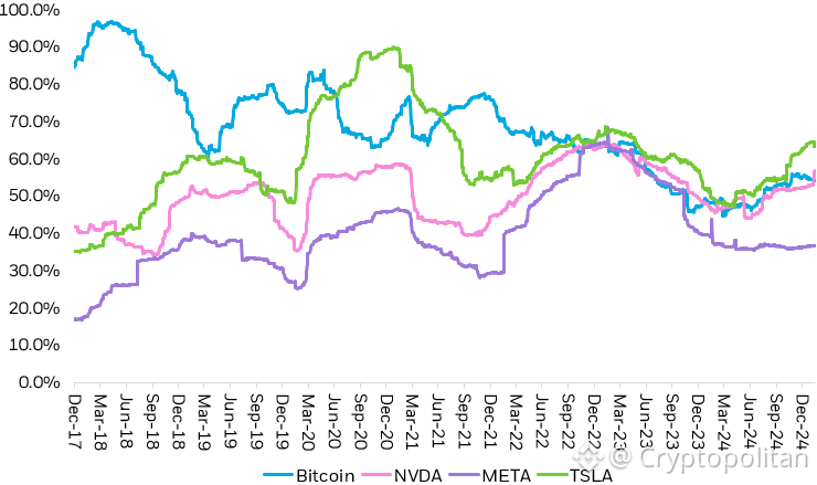 Bitcoin is often associated with its immense volatility and it remains so on an absolute basis. However, as time has passed, that degree of volatility has been coming down dramatically as BTC becomes a more mature, institutionally adopted asset with deeper liquidity. In fact, on a volatility adjusted basis, it’s actually increasingly comparable to certain mega cap tech stocks like Nvidia, Tesla and Meta.