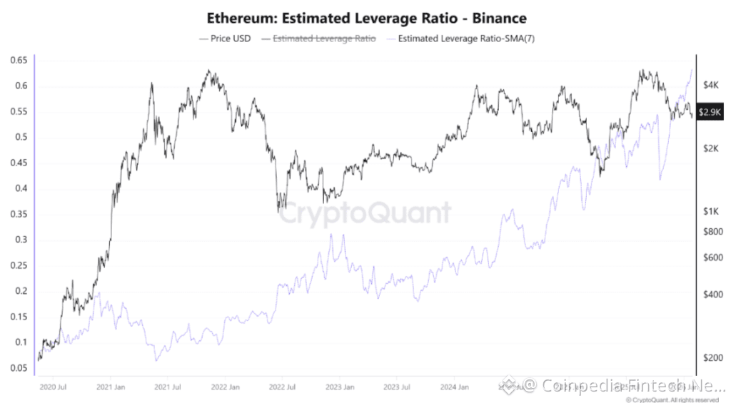 On-chain data shows that Ethereum’s Estimated Leverage Ratio on Binance is sitting at an all-time high, with the 7-day simple moving average rising to 0.632. In practical terms, this means a growing share of open positions is being funded through derivatives rather than spot buying, a setup that historically increases volatility rather than trend stability.