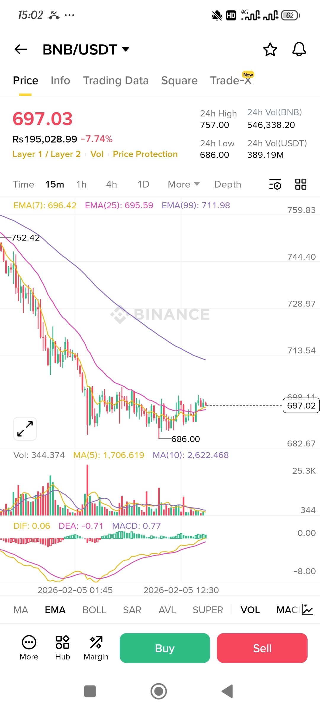 Moving Averages: * The price is currently trading below the EMA(99) (purple line at 711.98), which acts as a major resistance level.