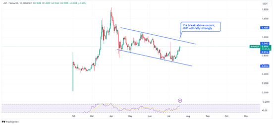 Hiện đang giao dịch trong một kênh giảm dần, Sao Mộc cần vượt qua phạm vi từ 1 đến 1,2 đô la để kích hoạt mức tăng 70% tiềm năng lên 1,85 đô la.