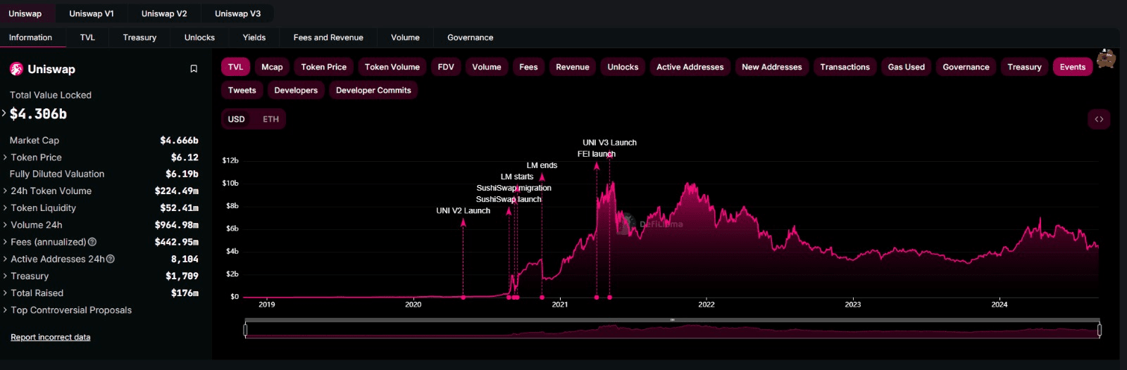 Uniswap là một giao thức DeFi phổ biến tạo điều kiện thuận lợi cho việc hoán đổi token trên hơn chục mạng blockchain. Theo DefiLlama, tính đến ngày 4 tháng 9, tổng giá trị bị khóa (TVL) của Uniswap là hơn 4,3 tỷ USD.