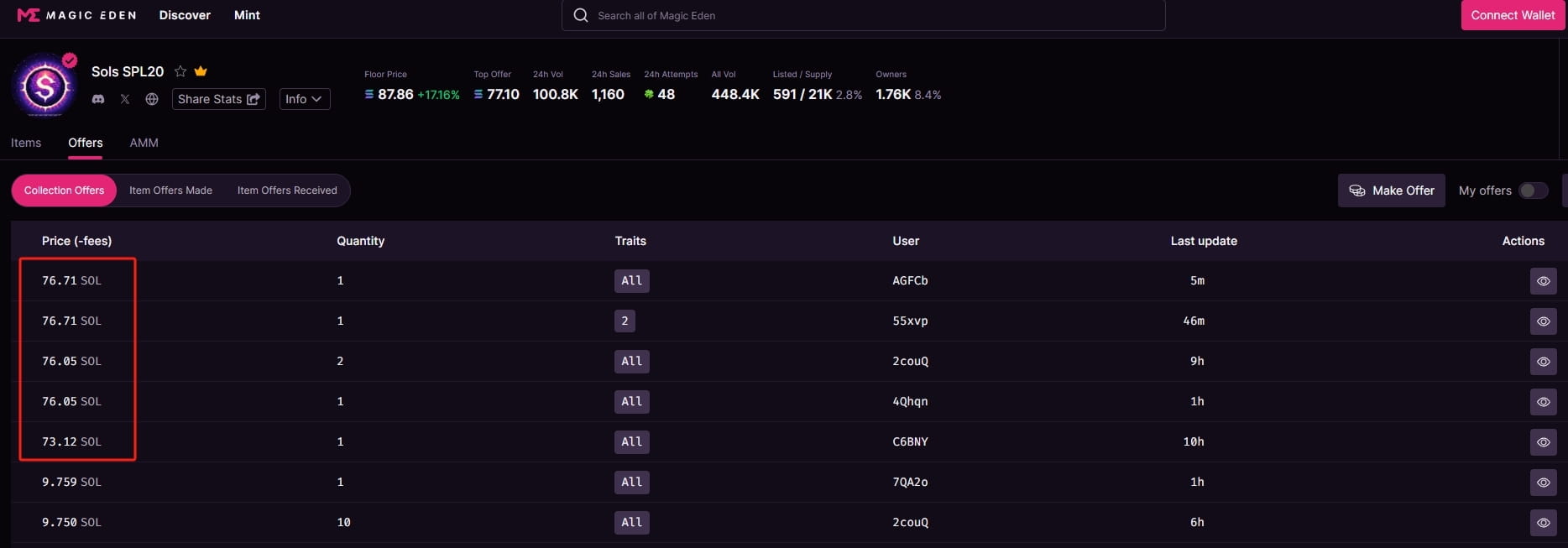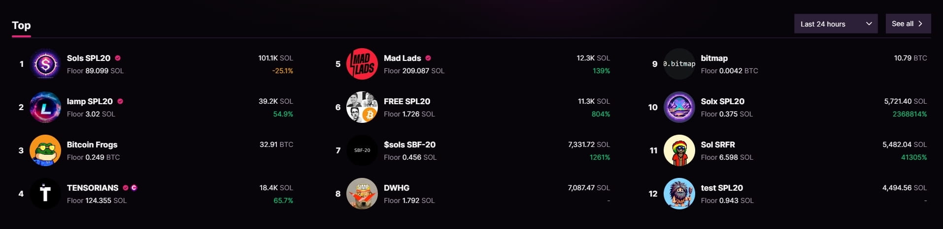 5. #magiceden, thị trường ký hiệu của @solana Chain, dẫn đầu bởi #Sols, tự hào có khối lượng giao dịch 24 giờ là 7,74 triệu đô la. Thị trường này cho phép bán ra ngay lập tức, nhưng sổ lệnh mua chỉ có 27.000 đô la. Vượt quá mức đó, chênh lệch giá là 87%...