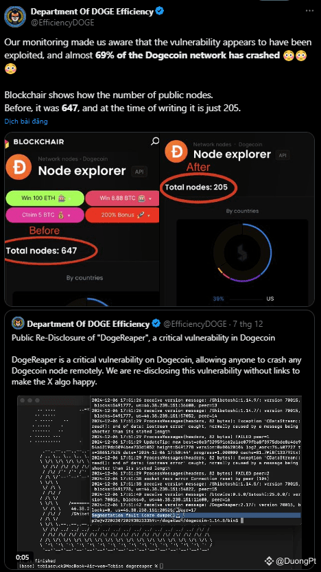 Theo Blockchair, số lượng nút hoạt động của $DOGE giảm từ 647 xuống còn 315 sau một vụ tấn công. Vụ việc khai thác lỗ hổng do Tobias Ruck phát hiện, được tài khoản “Department Of DOGE Efficiency” công bố ngày 4/12. Lỗ hổng, gọi là “DogeReaper” cho phép kẻ tấn công làm sập các nút Dogecoin từ xa.