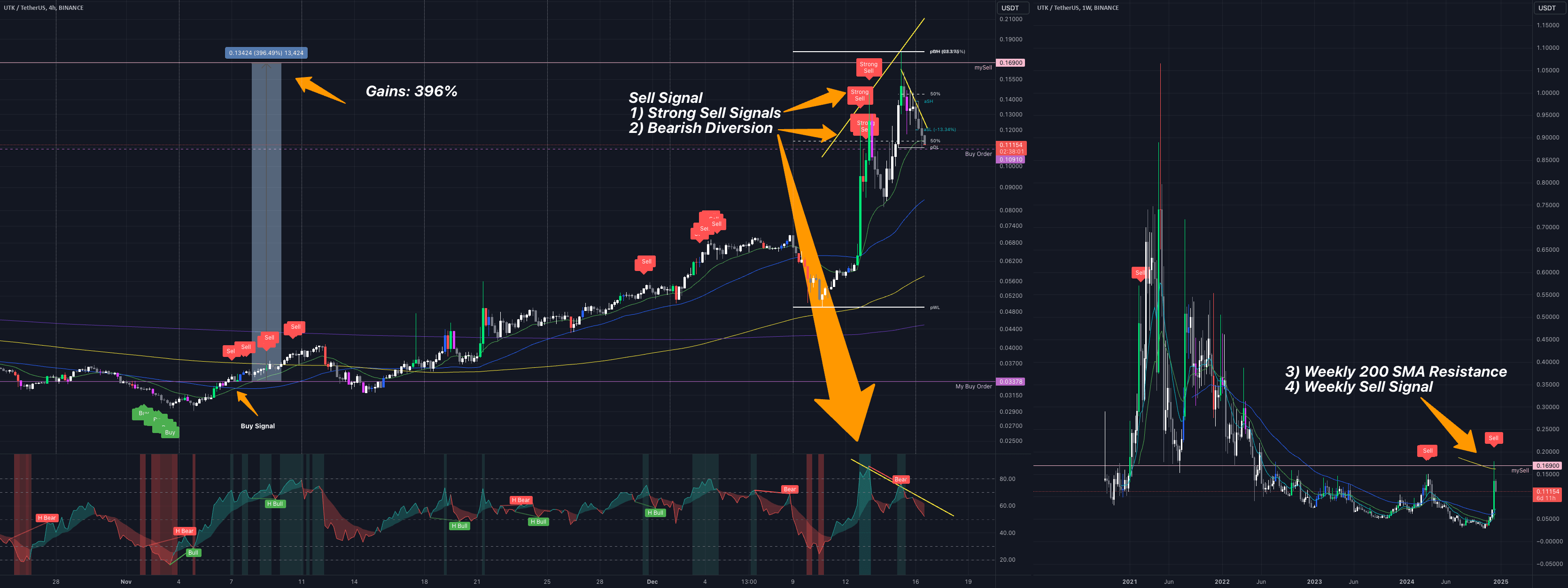 Khi nói đến giao dịch tiền điện tử, thời điểm là tất cả. Quyết định bán xMoney (UTK) của tôi dựa trên một loạt các tín hiệu rõ ràng từ phân tích kỹ thuật của tôi, cho thấy đã đến lúc thoát ra trước khi thị trường quay lưng lại với tôi. Sau đây là phân tích các lý do chính đằng sau giao dịch của tôi: